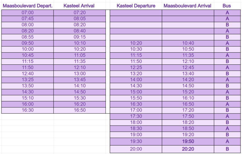 During the Maastricht Business Days Autumn Edition 2025 there will be a free shuttle from Maasboulevard to Kasteel and from Kasteel to Maasboulevard! Please stick to the times given below and make sure that you are waiting at the bus stop given below and not at the building!